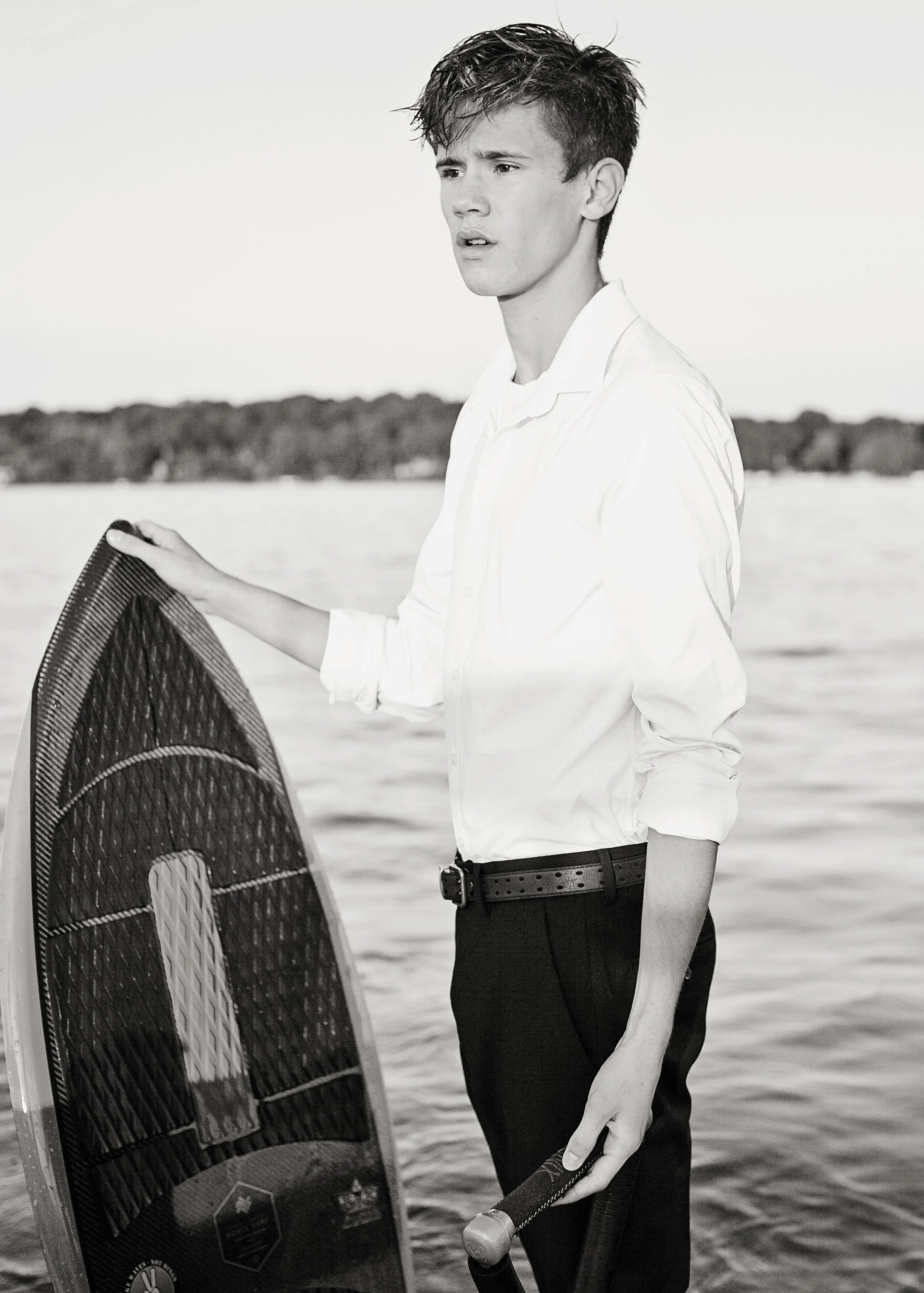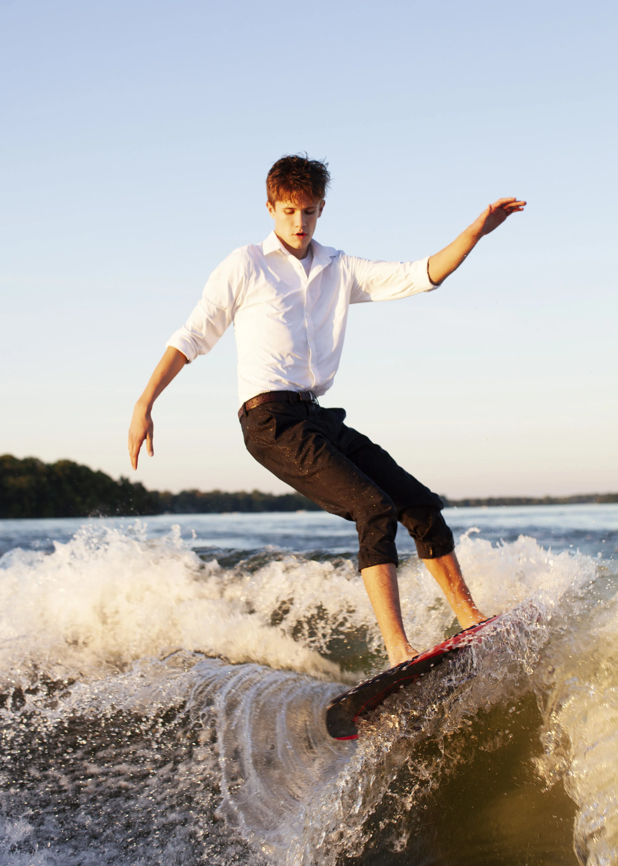For Scott’s shoot, we broke it up into two sessions. He can commonly be found wake surfing (and doing it well), so we wanted to capture him doing what he loves. We thought of the idea to have him dressed in a suit/formal wear could be a fun twist to your classic senior photo session. The tricky thing was to keep his clothes dry for at least a few pictures, which entailed jumping off the boat, while moving, onto the board while holding onto the rope. He gave it his best! Getting wet never hurt anyone…